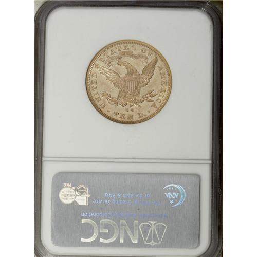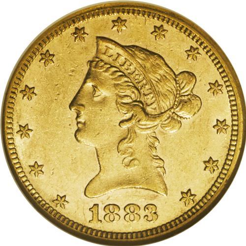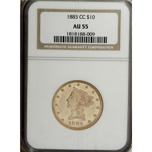 <B>1883-CC $10 AU55 NGC.</B></I> Original pinkish-golden color over bright, semi-reflective fields. The luminous traces of peripheral luster are particularly noticeable on the reverse. Richly detailed, and typically abraded. Only 12,000 pieces were struck and this is one of the more popular CC tens from the 1880s.<BR><BR><b>Shipping:</b> Coin/Currency (<a target="_blank" href="http://www.heritageauctions.com/common/shipping.php">view shipping information</a>)