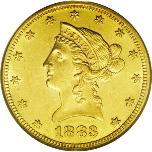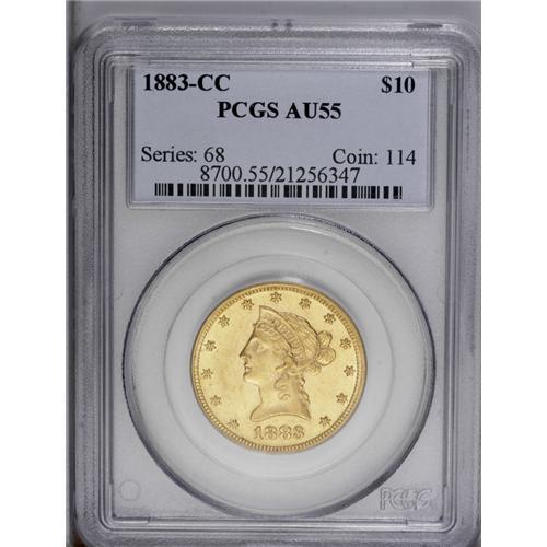 <B>1883-CC<$10> AU55 PCGS.</B></I> Moderately lustrous surfaces despite some light circulation. The wear is even, and there is no weakness to the strike. The mintage on this issue is only 12,000 coins, few of which have survived in higher than XF condition. Population: 7 in 55, 4 finer (7/06).