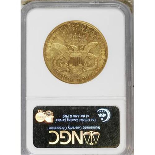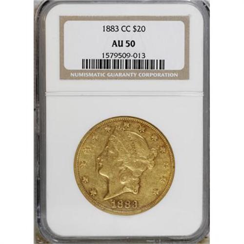 <B>1883-CC $20 AU50 NGC.</B></I> A lightly worn, but still crisp example. The surfaces are clean and luster is still present in the protected areas. A single vertical scratch in the left obverse field between Liberty's nose and mouth is noted. Although the original mintage was modest at 59,962 pieces, the 1883-CC is one of the more available Carson City double eagles. <BR><BR><B>Coin Engraver:</B> James B. Longacre<BR><BR><b>Shipping:</b> Coins & Currency (<a target="_blank" href="http://www.heritageauctions.com/common/shipping.php">view shipping information</a>)