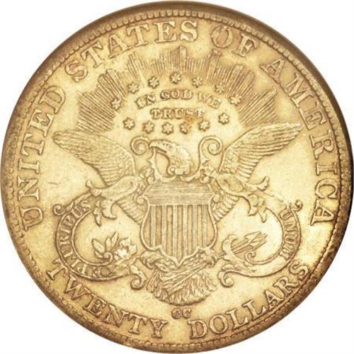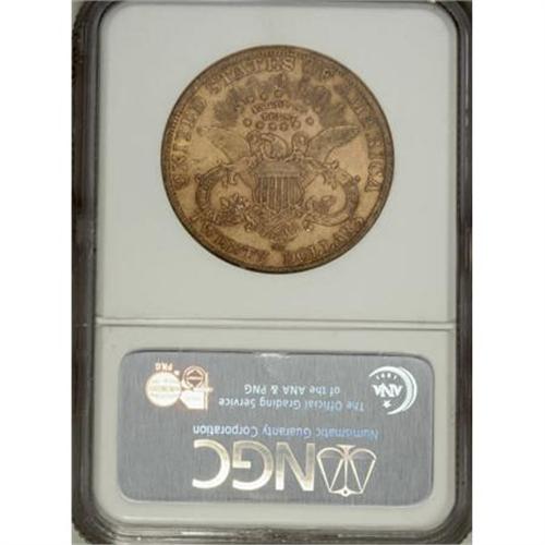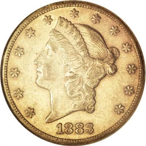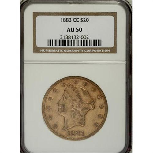 <B>1883-CC $20 AU50 NGC.</B></I> A generous mintage for the Carson City Mint, at nearly 60,000 coins, make this double eagle issue available in AU, but still rare in Choice Mint State. This piece shows some luster remaining on the orange-gold surfaces, with few abrasions for the grade and some smoke-gray toning over the high points.<BR><BR><B>Coin Engraver:</B> James B. Longacre<BR><BR><b>Shipping:</b> Coins & Currency (<a target="_blank" href="http://www.heritageauctions.com/common/shipping.php">view shipping information</a>)
