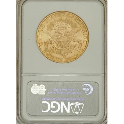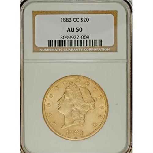 <B>1883-CC $20 AU50 NGC.</B></I> Much more lustrous than the typical AU50 example, this piece shows well impressed design elements and a mixture of green-gold and rose coloration. Only faintly worn on the highpoints, with numerous small to moderate abrasions on each side. <BR><BR><B>Coin Engraver:</B> James B. Longacre<BR><BR><b>Shipping:</b> Coins & Currency (<a target="_blank" href="http://www.heritageauctions.com/common/shipping.php">view shipping information</a>)