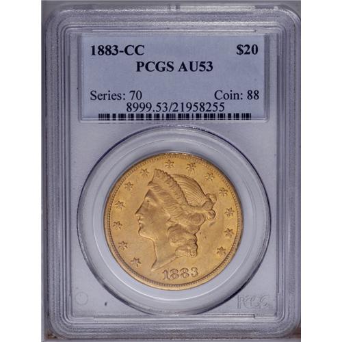 <B>1883-CC<$20> AU53 PCGS.</B></I> An attractive example of this more obtainable Carson City twenty. The surfaces are deep orange-gold with generous amounts of mint luster surrounding the devices. An original coin with several areas of deep incrustations on the reverse.