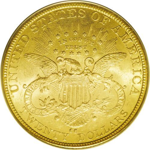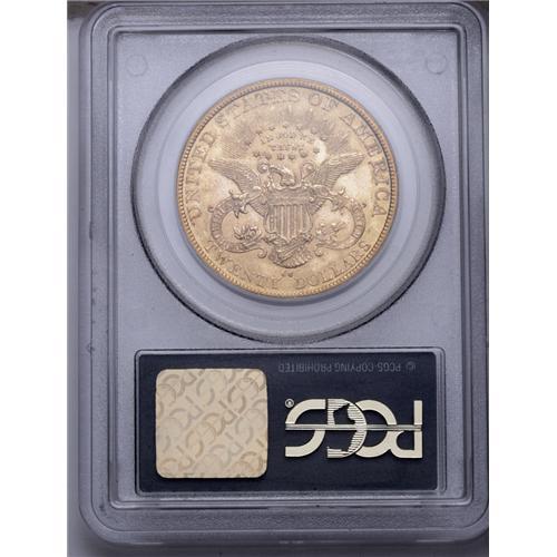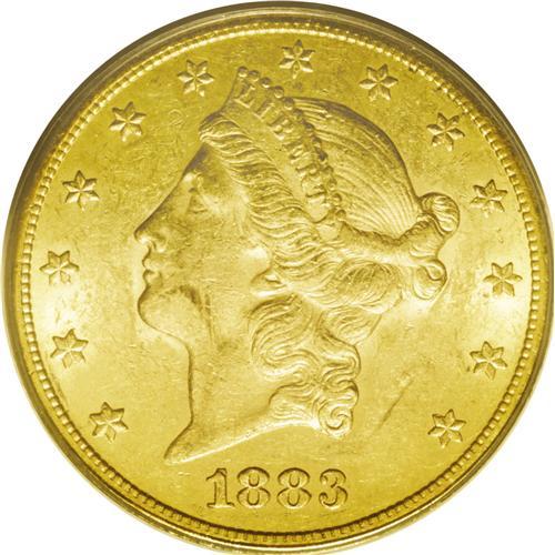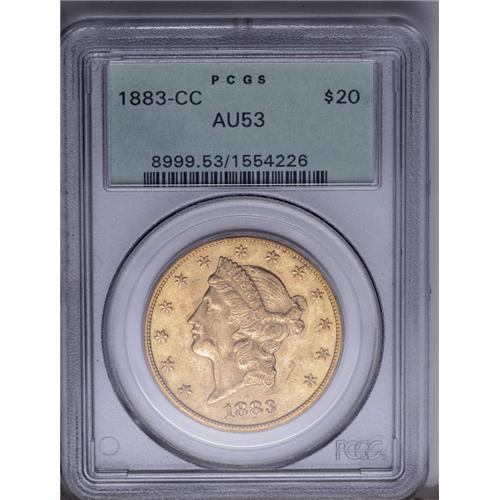 <B>1883-CC<$20> AU53 PCGS.</B></I> The Philadelphia Mint only produced proof double eagles in 1883, preferring to concentrate on lower denomination gold coins. In Carson City, just under 60,000 double eagles were coined, and the mintage in San Francisco totaled well over 1 million coins. By this time, the Comstock Lode yielded more of its product than the previous couple years, and much of the metal was deposited at the Carson City Mint. Much of the gold that was deposited at the Mint was coined into double eagles, the easiest denomination to produce. After they were coined, these pieces failed to circulate on an active basis, and were usually sealed in canvas bags. It was there that most known examples became abraded as the bags were moved back and forth. This example is a fully lustrous double eagle with brilliant medium yellow-gold color and hints of ebony toning on the highpoints. A few light scuffs and abrasions are evident on the obverse only. The reverse is exquisite. Encapsulated in a green label holder.<BR><I>From The Wyoming Collection.</B></I>