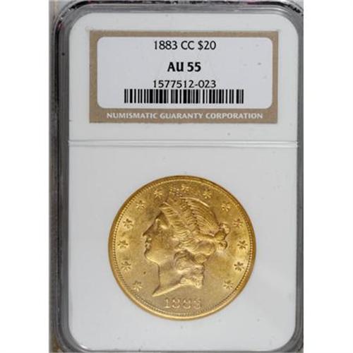 <B>1883-CC $20 AU55 NGC.</B></I> The 1883-CC is almost always seen with heavy abrasions. Douglas Winter (2006) writes: "It is very hard to find an 1883-CC double eagle relatively free of marks." This Choice AU has some light marks, but generates pleasing appeal. Yellow-gold surfaces show luster in the protected areas, and exhibit sharply struck devices.<BR><BR><B>Coin Engraver:</B> James B. Longacre<BR><BR><b>Shipping:</b> Coins & Currency (<a target="_blank" href="http://www.heritageauctions.com/common/shipping.php">view shipping information</a>)