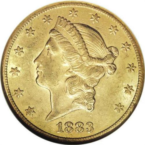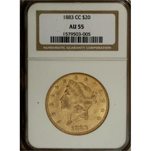 <B>1883-CC $20 AU55 NGC.</B></I> The lustrous orange-gold surfaces retain some prooflikeness in scattered areas. Most of the abrasions are light, but one each near the corner of Liberty's mouth and in the left obverse field require singular mention. The strike is well executed, and the overall effect is pleasing and attractive.<BR><BR><B>Coin Engraver:</B> James B. Longacre<BR><BR><b>Shipping:</b> Coins & Currency (<a target="_blank" href="http://www.heritageauctions.com/common/shipping.php">view shipping information</a>)