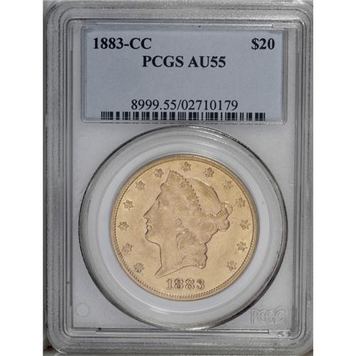 <B>1883-CC $20 AU55 PCGS.</B></I> Nicely struck with ample original luster. The vivid orange-gold surfaces have few marks compared to most pieces of this issue, and just a touch of light wear is noted on the devices.<BR><BR><b>Shipping:</b> Coin/Currency (<a target="_blank" href="http://www.heritageauctions.com/common/shipping.php">view shipping information</a>)