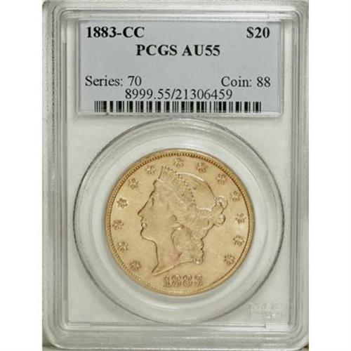 <B>1883-CC $20 AU55 PCGS.</B></I> This piece displays an extraordinary degree of mint luster, for an AU coin. The honey-gold coloration is imbued with greenish accents. Well struck and minimally worn, with a few moderate abrasions and some wispy hairlines in the fields. "A popular Carson City Mint issue, the 1883-CC double eagle is fairly common in most grades," according to Jeff Garrett and Ron Guth (2006). <BR><BR><B>Coin Engraver:</B> James B. Longacre<BR><BR><b>Shipping:</b> Coins & Currency (<a target="_blank" href="http://www.heritageauctions.com/common/shipping.php">view shipping information</a>)