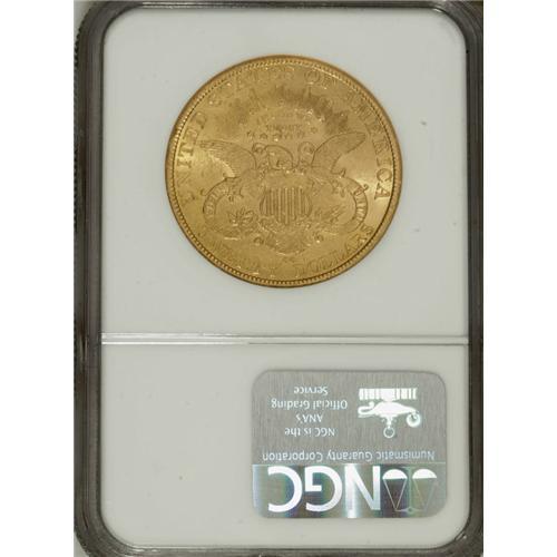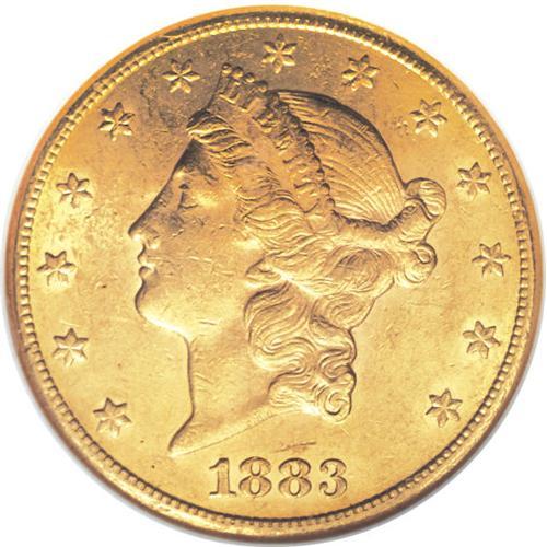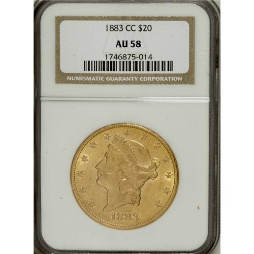 <B>1883-CC $20 AU58 NGC.</B></I> Most of the gold deposited by Comstock Lode miners at the Carson City Mint in this year was turned into double eagles, which were produced to the extent of nearly 60,000 pieces, while a much smaller number of eagles were produced. This makes the 1883-CC "common" by relative standards, yet only a few dozen Mint State examples are known. This piece offers lightly abraded mellow orange-red surfaces with loads of eye appeal and an above-average strike.<BR><BR><b>Shipping:</b> Coins & Currency (<a target="_blank" href="http://www.heritageauctions.com/common/shipping.php">view shipping information</a>)