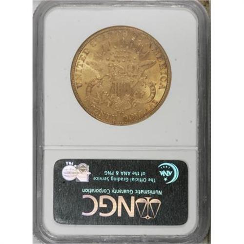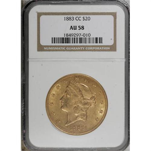 <B>1883-CC $20 AU58 NGC.</B></I> The yellow-orange surfaces retain most of their original soft luster, though light friction is present on the well-defined devices. This mid-date Carson City double eagle offers an unusually clean appearance, with few abrasions overall. Fewer than 60,000 pieces were struck.<BR><BR><b>Shipping:</b> Coins & Currency (<a target="_blank" href="http://www.heritageauctions.com/common/shipping.php">view shipping information</a>)