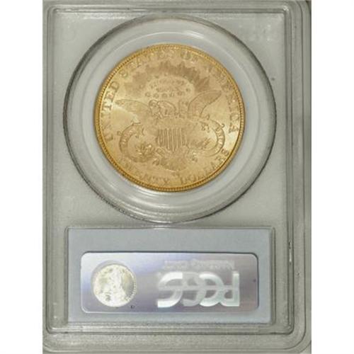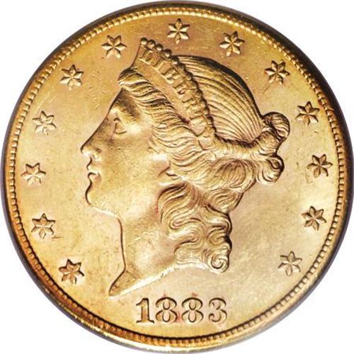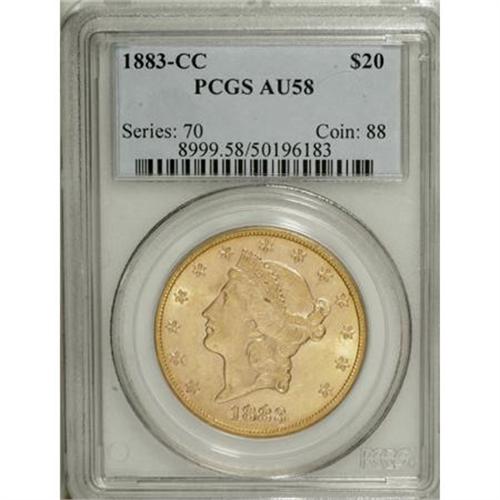 <B>1883-CC $20 AU58 PCGS.</B></I> Abundantly lustrous and well struck for the issue, this 1883-CC twenty has the eye appeal of a Mint State example. According to <I>Gold Coins of the Old West</B></I> by Doug Winter and Lawrence Cutler, this is variety 2-A (identifiable by a peculiar, small raised dot to the right of the 3 in the date). The authors state this variety is possibly less available than the other known variety of this popular date. Population: 69 in 58, 53 finer (6/07).<BR><BR><b>Shipping:</b> Coins & Currency (<a target="_blank" href="http://www.heritageauctions.com/common/shipping.php">view shipping information</a>)