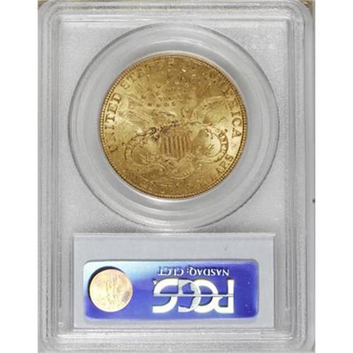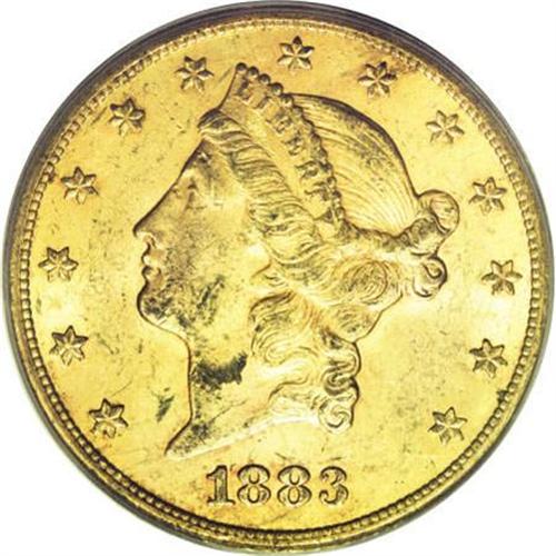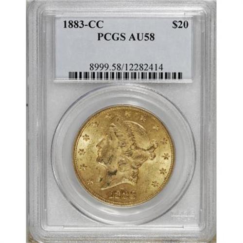 <B>1883-CC $20 AU58 PCGS.</B></I> The 1883 is fairly common in most grades, as large numbers resided overseas before returning to America. Yellow and khaki-green patination bathes each side of this lightly circulated specimen that retains considerable soft luster. A well executed strike lends sharpness to the design features, and a number of scuffs are visible.<BR><BR><B>Coin Engraver:</B> James B. Longacre<BR><BR><b>Shipping:</b> Coins & Currency (<a target="_blank" href="http://www.heritageauctions.com/common/shipping.php">view shipping information</a>)