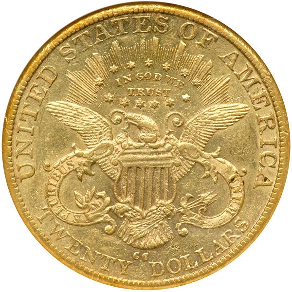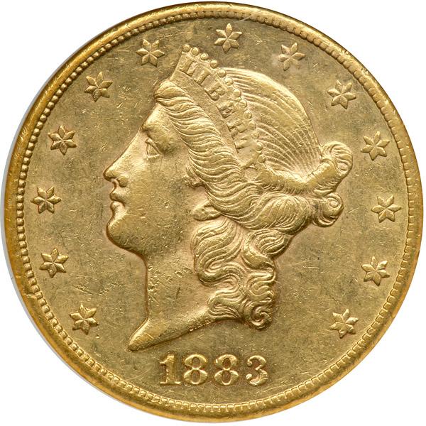1883-CC $20 Liberty. NGC graded AU-55. A decent coin for the grade. Lustrous surfaces display pale gold color with a bit of warmer gold patina near the edge, the overall appearance greatly bolstered by a smooth, almost blemish-free Liberty which somehow avoided contact with other coins. Regarding this date, the '83-CC is one of the most affordable CC-mint Twenties for collectors to acquire. Only 59,962 struck (PCGS # 8999) .