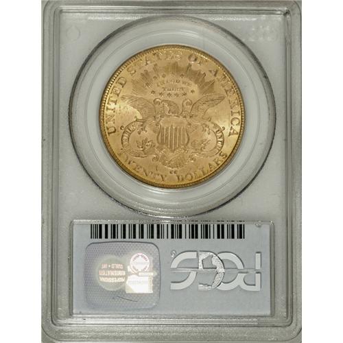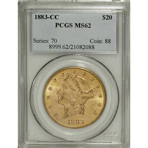 <B>1883-CC $20 MS62 PCGS.</B></I> Although the 1883-CC is "common" for a Carson City issue in lower grades, Choice examples are quite rare and hard to come by. The present piece offers lustrous yellow-orange surfaces that show some light scuffiness and grade-consistent abrasions, more so on the obverse, but the reverse is choice for the grade. The strike is well executed, and the eye appeal is considerable. This coin must be considered nearly unimprovable, as it is one of a dozen examples so graded at PCGS, with only two pieces finer, while NGC has certified nine MS62 coins, with three pieces finer (4/07).<BR><BR><b>Shipping:</b> Coins & Currency (<a target="_blank" href="http://www.heritageauctions.com/common/shipping.php">view shipping information</a>)