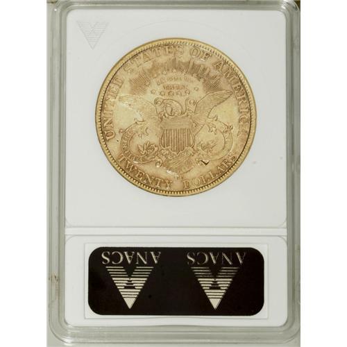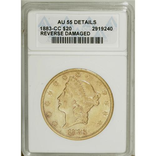 <B>1883-CC $20 --Reverse Damaged--ANACS. AU55 Details.</B></I> Substantial bright luster beckons from this briefly circulated Carson City piece. A small but relatively deep triangular punch mark is concealed near the base of the right scroll.<BR><BR><b>Shipping:</b> Coin/Currency (<a target="_blank" href="http://www.heritageauctions.com/common/shipping.php">view shipping information</a>)