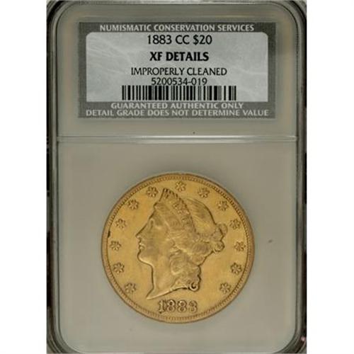 <B>1883-CC $20 --Improperly Cleaned--NCS. XF Details.</B></I> Although slightly glossy, this Carson City double eagle displays a generous amount of luster, particularly on the reverse. A moderate mark or two in Liberty's hair, but generally smooth for the XF grade.<BR><I>From The Chippewa Valley Collection.</B></I><BR><BR><B>Coin Engraver:</B> James B. Longacre<BR><BR><b>Shipping:</b> Coins & Currency (<a target="_blank" href="http://www.heritageauctions.com/common/shipping.php">view shipping information</a>)