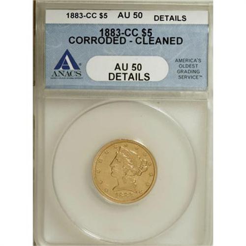 <B>1883-CC $5 --Corroded, Cleaned--ANACS. AU50 Details.</B></I> While some surface marks are noted through Liberty's cheek and mouth and the surfaces are unnaturally bright, the strike is also bold, there is little actual wear, and considerable appeal remains on this low-mintage piece. Nicer than the ANACS encapsulation would lead one to believe, and extremely rare in Mint State.<BR><BR><B>Coin Engraver:</B> Christian Gobrecht<BR><BR><b>Shipping:</b> Coins & Currency (<a target="_blank" href="http://www.heritageauctions.com/common/shipping.php">view shipping information</a>)