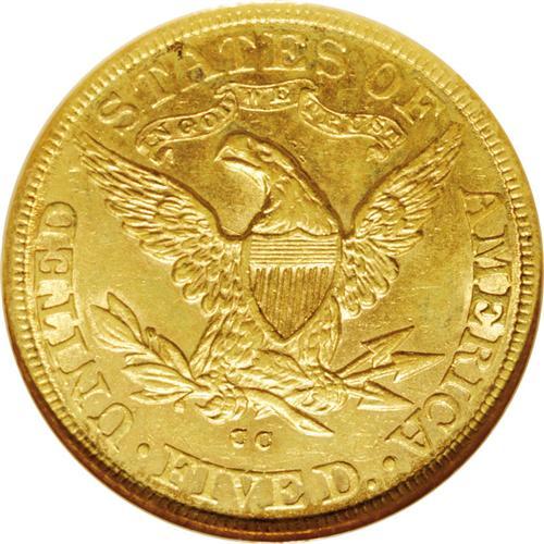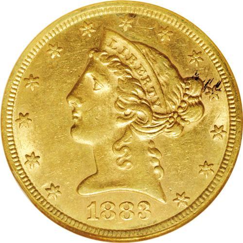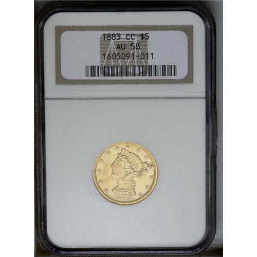 <B>1883-CC $5 AU58 NGC.</B></I> Bright and satiny with pale golden color throughout. Just a hint of striking softness is noted on Liberty's highest curls and on the eagle's neck feathers. A few easily overlooked grease stains are found in the vicinity of star 10. The low mintage 1883-CC half eagle, one of a mere 12,958 pieces struck, is very scarce in grades approaching Mint State and an extreme rarity at the Uncirculated level. Census: 32 in 58, 3 finer (1/06).