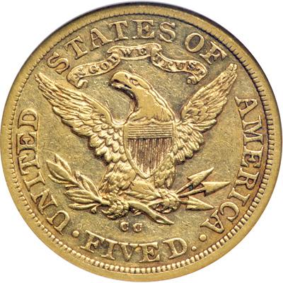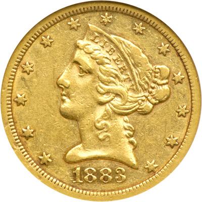 1883-CC $5 Liberty. ANACS graded EF-45. Mostly untoned with slightly reflective surfaces. We note some marks about the obverse borders.