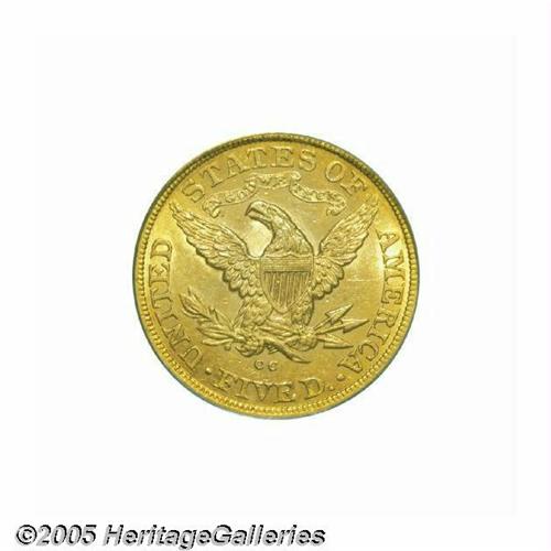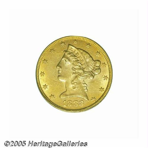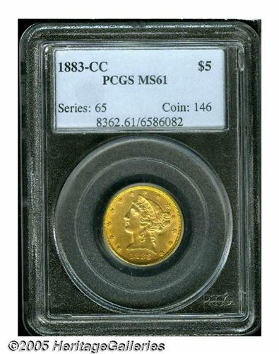<B>1883-CC<$5> MS61 PCGS.</B></I> Well struck and lustrous with rich orange-gold color. There are some noticeable abrasions including a few in the left obverse field but these are not out of keeping with the assigned grade. This is one of just six known examples of this date in Uncirculated condition. The finest of these sold in July 2002 as part of the Henry Lang collection, realized $29,900.<BR> Carson City Half Eagles from the 1880s are much less rare than their counterparts from the 1870s. The 1881-CC is easily the rarest of the five issues from this decade, while the 1883-CC and the 1884-CC are in the next tier. There are around two dozen AU examples of the 1883-CC known as well as six Uncirculated pieces. Significant mint state coins are as follows:<BR><BR> 1. Bowers and Merena 7/02: 620 ($29,900, as PCGS MS61); Ex: Bowers and Merena 1/94: 1413 ($15,950); Superior 2/92: 2699 ($9,818 as PCGS MS60). Graded MS62 by PCGS.<BR><BR> 2. Washington D.C. Collection. Graded MS61 by NGC.<BR><BR> 3. This piece; Ex: Midwestern Collection; Superior 3/00: 895 (unsold); Stack's 3/98: 1562 ($16,500); Bowers and Merena 1/86: 292. Graded MS61 by PCGS.