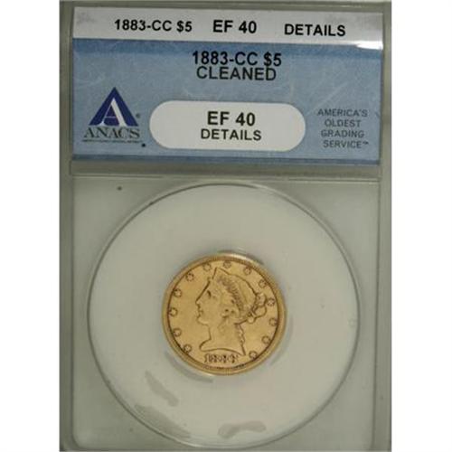 <B>1883-CC $5 --Cleaned--ANACS. XF40 Details.</B></I> Typically detailed for this Carson City issue, with solid definition on the portrait but softness at the eagle's neck. Cloudy, suspiciously luminous yellow-gold and wheat-gold surfaces show a number of hairlines, particularly at the lower reverse.<BR><I>Ex: George N. Polis, M.D. and Other Properties, Bowers and Merena, June 10-11, 1991, lot 3089.</B></I><B></B></I><BR><I>From The John Stimson, Sr. Collection, Part Two.</B></I><BR><BR><B>Coin Engraver:</B> Christian Gobrecht<BR><BR><b>Shipping:</b> Coins & Currency (<a target="_blank" href="http://www.heritageauctions.com/common/shipping.php">view shipping information</a>)