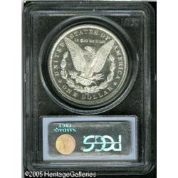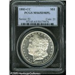 <B>1883-CC<img border='0' src='http://www.heritagecoins.com/images/star.gif' width=10 height=10>$1 MS65 Deep Mirror Prooflike PCGS.</B></I> A glittering, deeply mirrored example of this "common" Carson City date. The devices are heavily frosted and provide strong cameo contrast against the unfathomable depth of reflectivity seen in the fields. Sharply defined and very attractive. Lot:10125