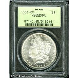 <B>1883-CC<img border='0' src='http://www.heritagecoins.com/images/star.gif' width=10 height=10>$1 MS65 Deep Mirror Prooflike PCGS.</B></I> A sharply struck and flashy Gem with a hint of gold color on each side. A carefully preserved piece that has mild cameo frost on the devices. Certified in a green label holder. Lot:10123