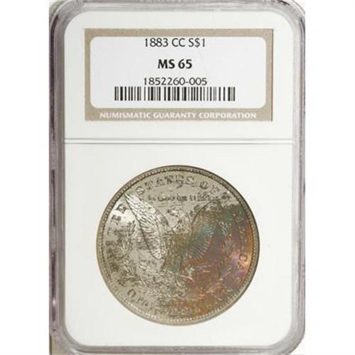 <B>1883-CC $1 MS65 NGC,</B></I> the right reverse has splashes of violet-red, emerald-green, and orange; and an <B>1884-CC MS64 PCGS,</B></I> the obverse is dominated by gold, lilac, sky-blue, and apple-green, the left obverse is typically abraded.<BR><BR><B>Coin Engraver:</B> George T. Morgan<BR><BR><b>Shipping:</b> Coins & Currency (<a target="_blank" href="http://www.heritageauctions.com/common/shipping.php">view shipping information</a>)