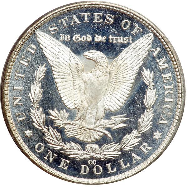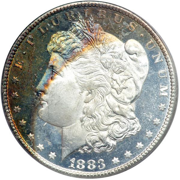 1883-CC Morgan Dollar. PCGS graded MS-65 Deep Mirror Prooflike. Mostly white with slight light gold tone on the left obverse side. A stunning coin and another in this fine selection of quality toned Morgan silver dollars. The deep mirror finish adds immensely to the overall appearance (PCGS # 97145) .