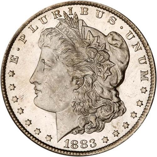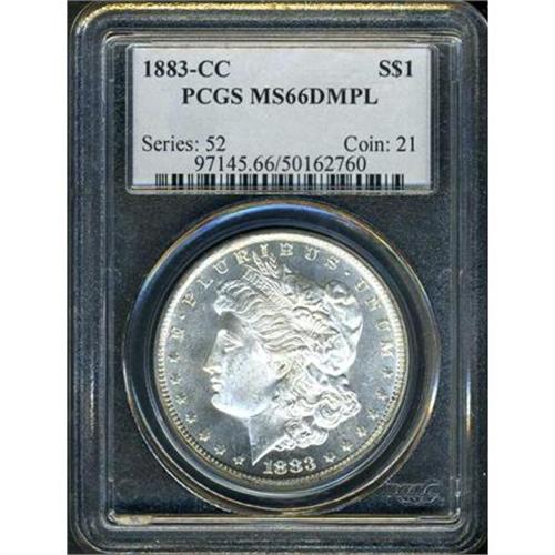 <b>1883-CC Morgan Dollar. PCGS graded MS66 DMPL.</b> This is an amazing cameo prooflike dollar. But why should we be surprised with all the high quality type coins and Morgan dollar gems that are contained in this sale? But don't overlook this glassy mirrored Gem '83-CC because of the embarrassment of riches seen elsewhere in this catalog. The devices are virtually flawless and the contrast just could not be any stronger between the fields and devices. Fully struck also <b>(PCGS # 97145)</b>