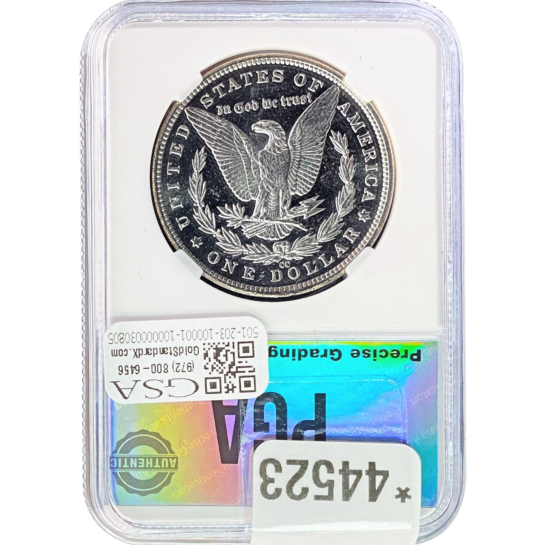 e. Coins sold referencing a third-party grading service are sold “AS IS” without any express or implied warranty, except for a guarantee by GSA that they are genuine. Removal or alteration of the holder, voids all of Bidder’s claims concerning that Product. Certain warranties may be available from the grading services and Bidders are referred to them for further details: Numismatic Guaranty Corporation (NGC), PO Box 4776, Sarasota, FL 34230, www.ngccoin.com/services/writtenguarantee.asp; Professional Coin Grading Services (PCGS), PO Box 9458, Newport Beach, CA 92658, www.pcgs.com/guarantee.html; ANACS, 6555 S. Kenton St., Ste. 303, Englewood, CO 80111; and Independent Coin Grading Co. (ICG), 7901 East Bellview, Ave., Suite 50, Englewood, CO 80111.