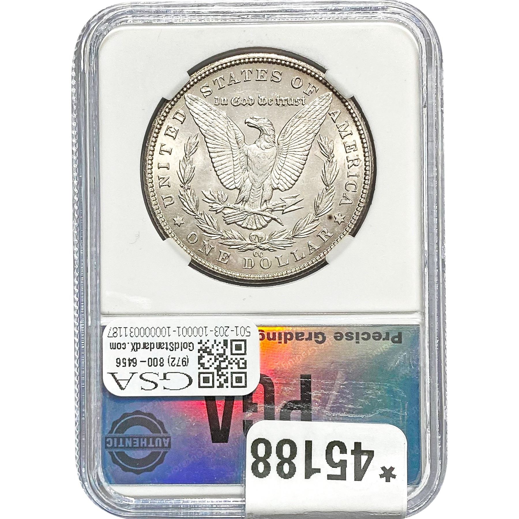 e. Coins sold referencing a third-party grading service are sold “AS IS” without any express or implied warranty, except for a guarantee by GSA that they are genuine. Removal or alteration of the holder, voids all of Bidder’s claims concerning that Product. Certain warranties may be available from the grading services and Bidders are referred to them for further details: Numismatic Guaranty Corporation (NGC), PO Box 4776, Sarasota, FL 34230, www.ngccoin.com/services/writtenguarantee.asp; Professional Coin Grading Services (PCGS), PO Box 9458, Newport Beach, CA 92658, www.pcgs.com/guarantee.html; ANACS, 6555 S. Kenton St., Ste. 303, Englewood, CO 80111; and Independent Coin Grading Co. (ICG), 7901 East Bellview, Ave., Suite 50, Englewood, CO 80111.