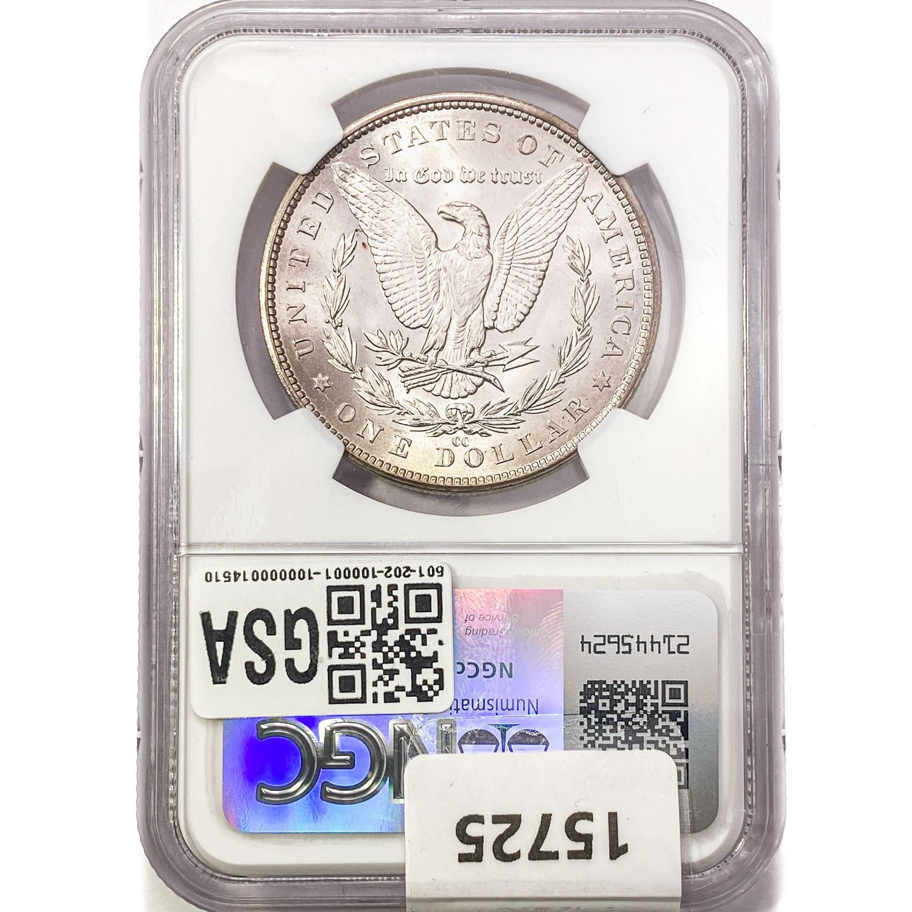 COINS AND CURRENCY LISTED IN GSA’S CATALOG AS GRADED AND ENCAPSULATED BY PCGS, NGC, ANACS, ICG, PCGS CURRENCY, PMG, PCGS BANKNOTE GRADING, CMC OR ANY OTHER THIRD-PARTY GRADING SERVICE ARE LIKEWISE SOLD “AS-IS” EXCEPT AS EXPRESSLY SET FORTH HEREIN. ALL THIRD-PARTY GRADING SERVICE GUARANTEES, INCLUDING AUTHENTICITY, ARE THE SOLE RESPONSIBILITY OF THE THIRD-PARTY GRADING SERVICE AND NOT WARRANTIES OR GUARANTEES OF GSA. BIDDERS SHOULD CONTACT THESE THIRD-PARTY GRADING SERVICES DIRECTLY WITH RESPECT TO ANY CLAIMS OR QUESTIONS THEY MAY HAVE CONCERNING THEIR GUARANTEES AND WARRANTIES. BIDDERS ACKNOWLEDGE AND AGREE THAT AUCTIONEER IS NOT BOUND BY OR LIABLE FOR ANY OPINION OR CERTIFICATION BY ANY THIRD-PARTY GRADING SERVICE. REMOVAL OF A PRODUCT FROM ITS PROTECTIVE CASING OR HOLDER OR ALTERATION OF ANY COIN HOLDER WAIVES ALL RIGHTS CONCERNING THE PRODUCT CONTAINED THEREIN.