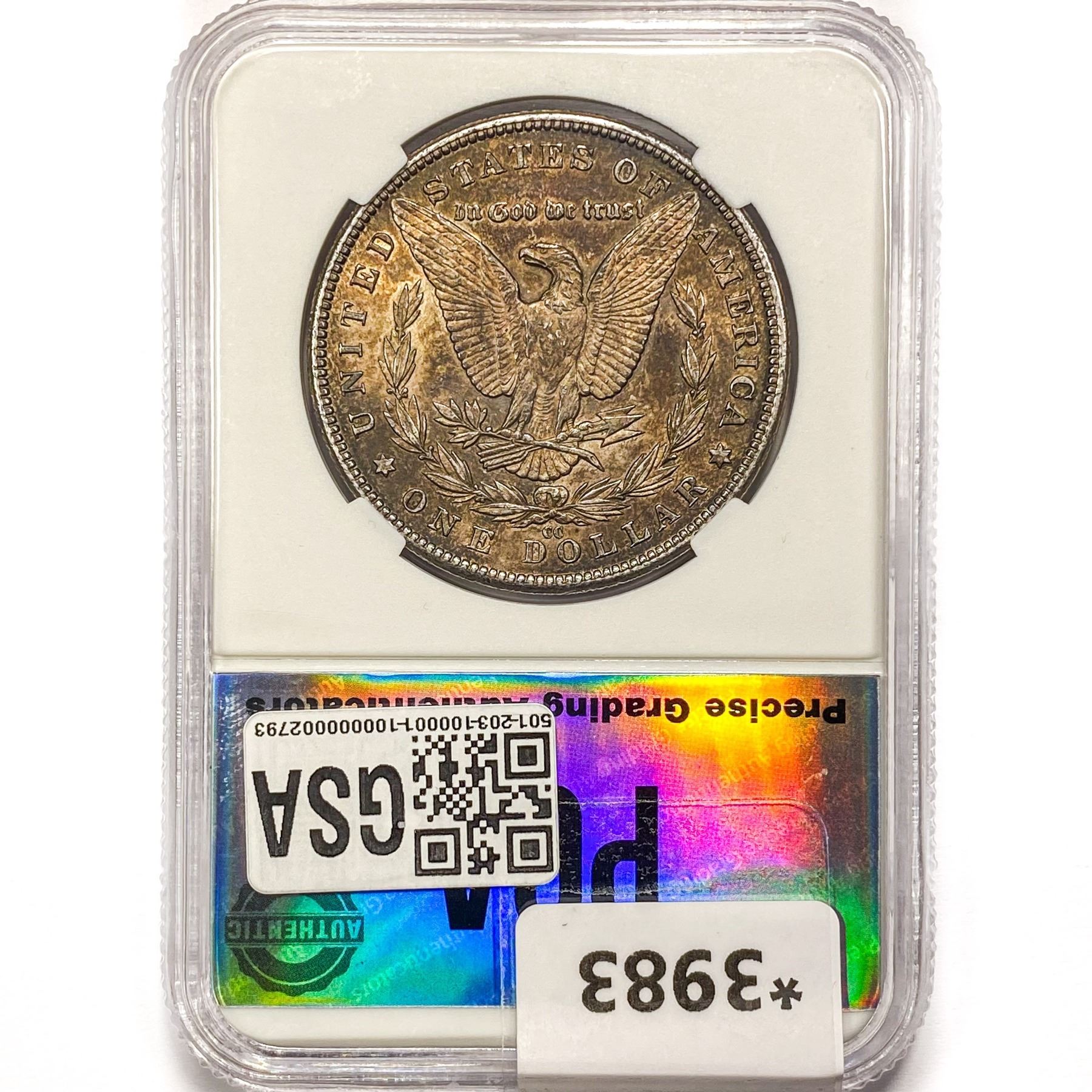 COINS AND CURRENCY LISTED IN GSA’S CATALOG AS GRADED AND ENCAPSULATED BY PCGS, NGC, ANACS, ICG, PCGS CURRENCY, PMG, PCGS BANKNOTE GRADING, CMC OR ANY OTHER THIRD-PARTY GRADING SERVICE ARE LIKEWISE SOLD “AS-IS” EXCEPT AS EXPRESSLY SET FORTH HEREIN. ALL THIRD-PARTY GRADING SERVICE GUARANTEES, INCLUDING AUTHENTICITY, ARE THE SOLE RESPONSIBILITY OF THE THIRD-PARTY GRADING SERVICE AND NOT WARRANTIES OR GUARANTEES OF GSA. BIDDERS SHOULD CONTACT THESE THIRD-PARTY GRADING SERVICES DIRECTLY WITH RESPECT TO ANY CLAIMS OR QUESTIONS THEY MAY HAVE CONCERNING THEIR GUARANTEES AND WARRANTIES. BIDDERS ACKNOWLEDGE AND AGREE THAT AUCTIONEER IS NOT BOUND BY OR LIABLE FOR ANY OPINION OR CERTIFICATION BY ANY THIRD-PARTY GRADING SERVICE. REMOVAL OF A PRODUCT FROM ITS PROTECTIVE CASING OR HOLDER OR ALTERATION OF ANY COIN HOLDER WAIVES ALL RIGHTS CONCERNING THE PRODUCT CONTAINED THEREIN.