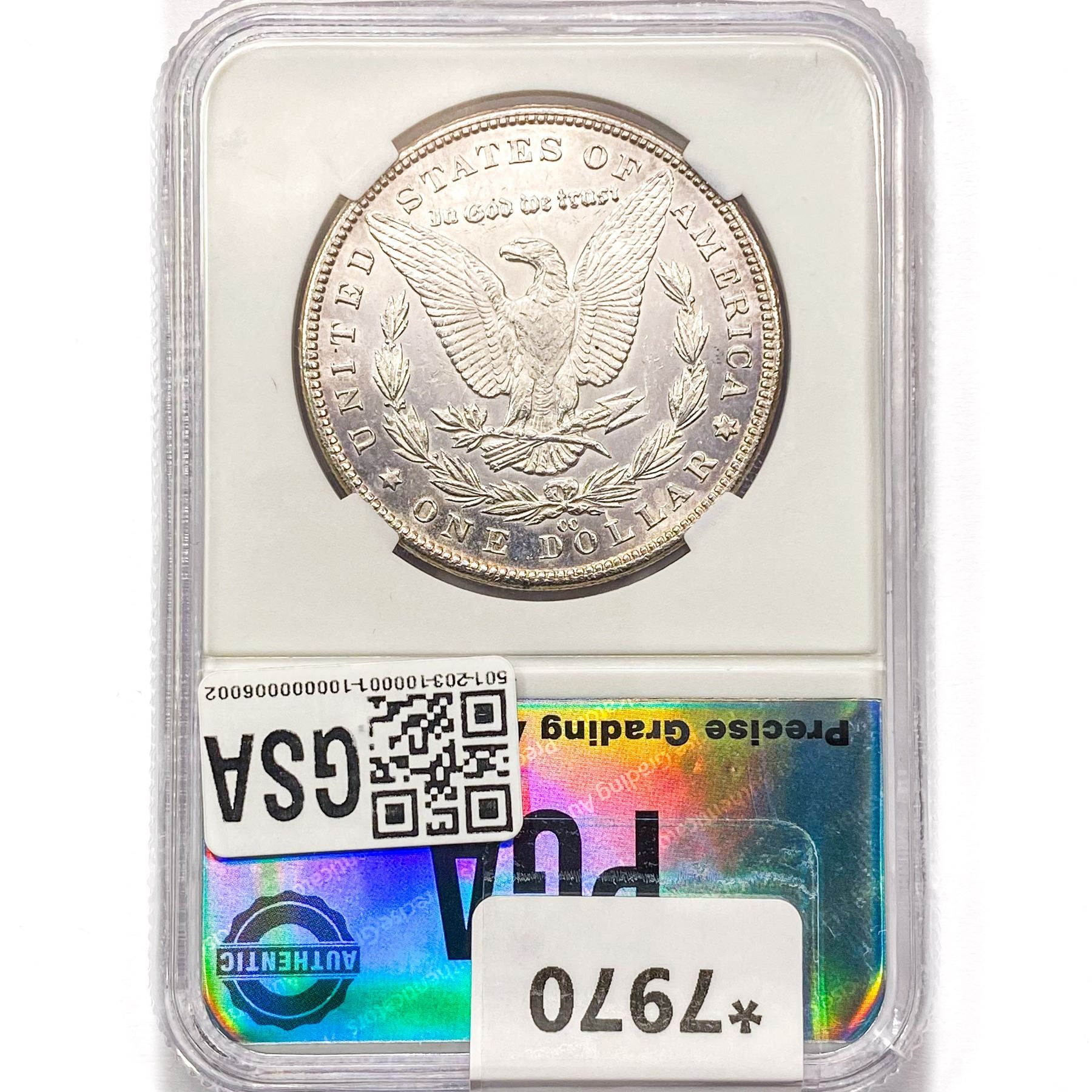 COINS AND CURRENCY LISTED IN GSA’S CATALOG AS GRADED AND ENCAPSULATED BY PCGS, NGC, ANACS, ICG, PCGS CURRENCY, PMG, PCGS BANKNOTE GRADING, CMC OR ANY OTHER THIRD-PARTY GRADING SERVICE ARE LIKEWISE SOLD “AS-IS” EXCEPT AS EXPRESSLY SET FORTH HEREIN. ALL THIRD-PARTY GRADING SERVICE GUARANTEES, INCLUDING AUTHENTICITY, ARE THE SOLE RESPONSIBILITY OF THE THIRD-PARTY GRADING SERVICE AND NOT WARRANTIES OR GUARANTEES OF GSA. BIDDERS SHOULD CONTACT THESE THIRD-PARTY GRADING SERVICES DIRECTLY WITH RESPECT TO ANY CLAIMS OR QUESTIONS THEY MAY HAVE CONCERNING THEIR GUARANTEES AND WARRANTIES. BIDDERS ACKNOWLEDGE AND AGREE THAT AUCTIONEER IS NOT BOUND BY OR LIABLE FOR ANY OPINION OR CERTIFICATION BY ANY THIRD-PARTY GRADING SERVICE. REMOVAL OF A PRODUCT FROM ITS PROTECTIVE CASING OR HOLDER OR ALTERATION OF ANY COIN HOLDER WAIVES ALL RIGHTS CONCERNING THE PRODUCT CONTAINED THEREIN.