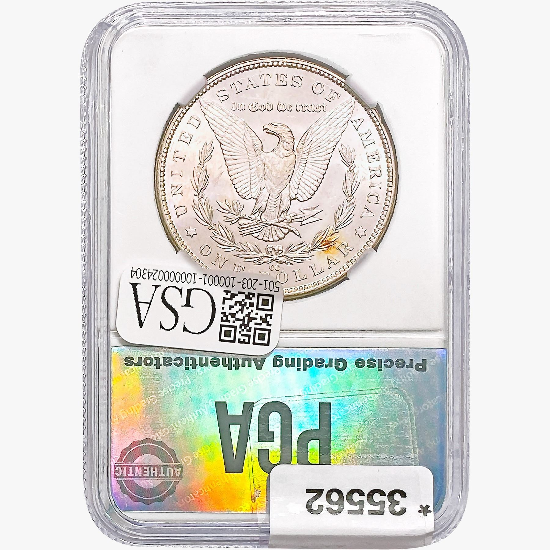 COINS AND CURRENCY LISTED IN GSA’S CATALOG AS GRADED AND ENCAPSULATED BY PCGS, NGC, ANACS, ICG, PCGS CURRENCY, PMG, PCGS BANKNOTE GRADING, CMC OR ANY OTHER THIRD-PARTY GRADING SERVICE ARE LIKEWISE SOLD “AS-IS” EXCEPT AS EXPRESSLY SET FORTH HEREIN. ALL THIRD-PARTY GRADING SERVICE GUARANTEES, INCLUDING AUTHENTICITY, ARE THE SOLE RESPONSIBILITY OF THE THIRD-PARTY GRADING SERVICE AND NOT WARRANTIES OR GUARANTEES OF GSA. BIDDERS SHOULD CONTACT THESE THIRD-PARTY GRADING SERVICES DIRECTLY WITH RESPECT TO ANY CLAIMS OR QUESTIONS THEY MAY HAVE CONCERNING THEIR GUARANTEES AND WARRANTIES. BIDDERS ACKNOWLEDGE AND AGREE THAT AUCTIONEER IS NOT BOUND BY OR LIABLE FOR ANY OPINION OR CERTIFICATION BY ANY THIRD-PARTY GRADING SERVICE. REMOVAL OF A PRODUCT FROM ITS PROTECTIVE CASING OR HOLDER OR ALTERATION OF ANY COIN HOLDER WAIVES ALL RIGHTS CONCERNING THE PRODUCT CONTAINED THEREIN.