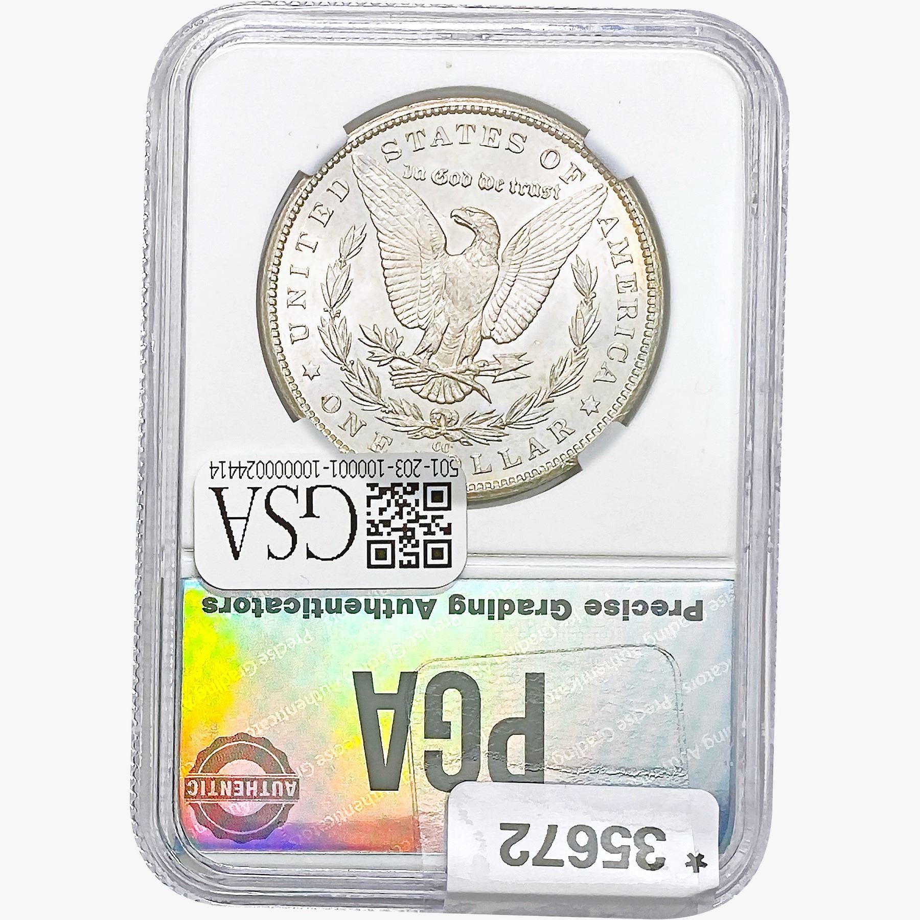COINS AND CURRENCY LISTED IN GSA’S CATALOG AS GRADED AND ENCAPSULATED BY PCGS, NGC, ANACS, ICG, PCGS CURRENCY, PMG, PCGS BANKNOTE GRADING, CMC OR ANY OTHER THIRD-PARTY GRADING SERVICE ARE LIKEWISE SOLD “AS-IS” EXCEPT AS EXPRESSLY SET FORTH HEREIN. ALL THIRD-PARTY GRADING SERVICE GUARANTEES, INCLUDING AUTHENTICITY, ARE THE SOLE RESPONSIBILITY OF THE THIRD-PARTY GRADING SERVICE AND NOT WARRANTIES OR GUARANTEES OF GSA. BIDDERS SHOULD CONTACT THESE THIRD-PARTY GRADING SERVICES DIRECTLY WITH RESPECT TO ANY CLAIMS OR QUESTIONS THEY MAY HAVE CONCERNING THEIR GUARANTEES AND WARRANTIES. BIDDERS ACKNOWLEDGE AND AGREE THAT AUCTIONEER IS NOT BOUND BY OR LIABLE FOR ANY OPINION OR CERTIFICATION BY ANY THIRD-PARTY GRADING SERVICE. REMOVAL OF A PRODUCT FROM ITS PROTECTIVE CASING OR HOLDER OR ALTERATION OF ANY COIN HOLDER WAIVES ALL RIGHTS CONCERNING THE PRODUCT CONTAINED THEREIN.