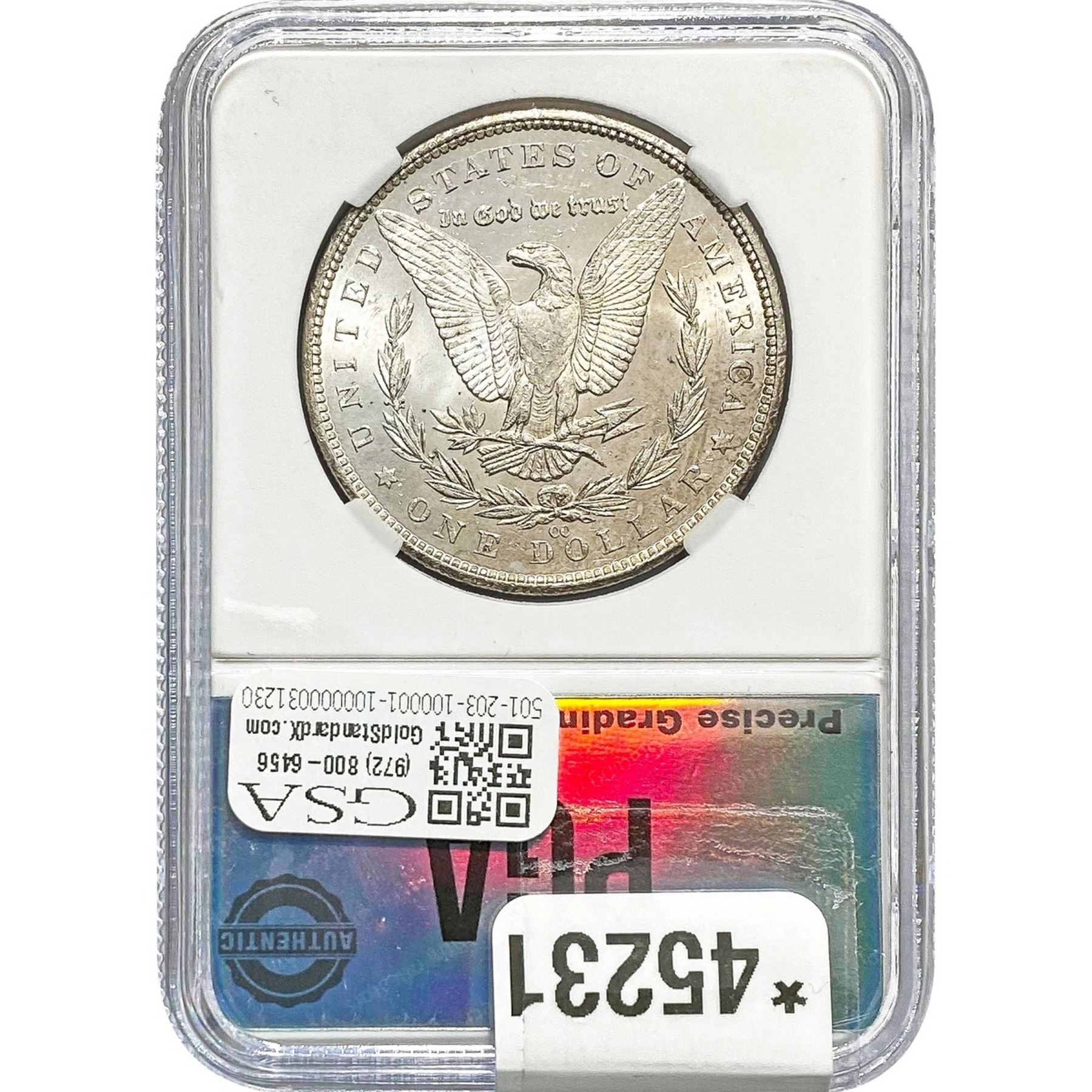 COINS AND CURRENCY LISTED IN GSA’S CATALOG AS GRADED AND ENCAPSULATED BY PCGS, NGC, ANACS, ICG, PCGS CURRENCY, PMG, PCGS BANKNOTE GRADING, CMC OR ANY OTHER THIRD-PARTY GRADING SERVICE ARE LIKEWISE SOLD “AS-IS” EXCEPT AS EXPRESSLY SET FORTH HEREIN. ALL THIRD-PARTY GRADING SERVICE GUARANTEES, INCLUDING AUTHENTICITY, ARE THE SOLE RESPONSIBILITY OF THE THIRD-PARTY GRADING SERVICE AND NOT WARRANTIES OR GUARANTEES OF GSA. BIDDERS SHOULD CONTACT THESE THIRD-PARTY GRADING SERVICES DIRECTLY WITH RESPECT TO ANY CLAIMS OR QUESTIONS THEY MAY HAVE CONCERNING THEIR GUARANTEES AND WARRANTIES. BIDDERS ACKNOWLEDGE AND AGREE THAT AUCTIONEER IS NOT BOUND BY OR LIABLE FOR ANY OPINION OR CERTIFICATION BY ANY THIRD-PARTY GRADING SERVICE. REMOVAL OF A PRODUCT FROM ITS PROTECTIVE CASING OR HOLDER OR ALTERATION OF ANY COIN HOLDER WAIVES ALL RIGHTS CONCERNING THE PRODUCT CONTAINED THEREIN.