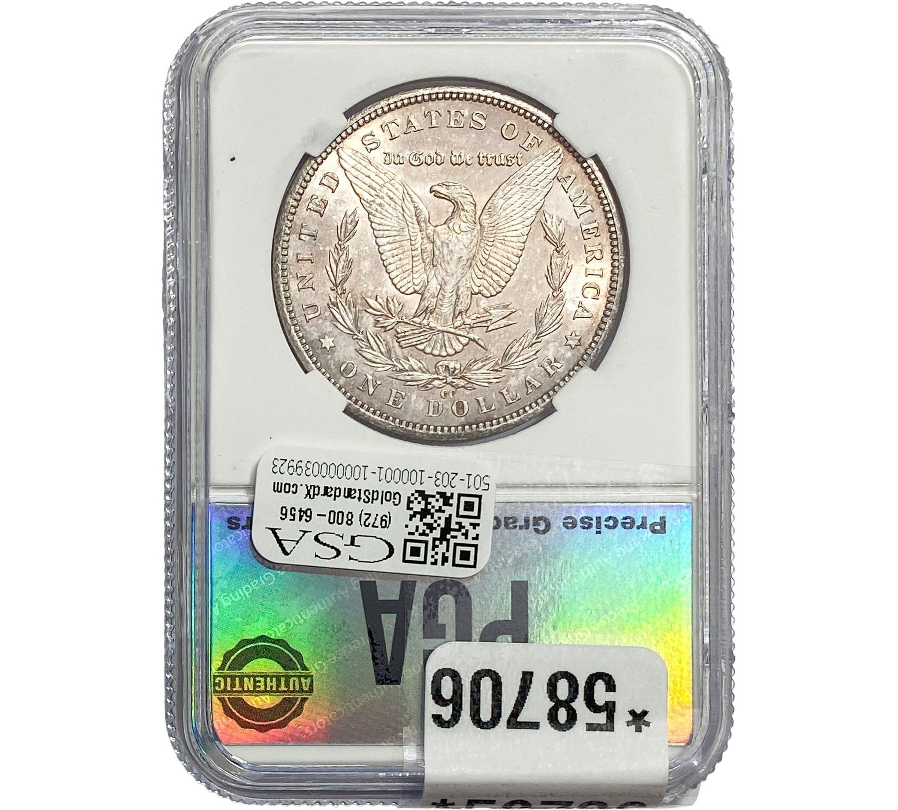 COINS AND CURRENCY LISTED IN GSA’S CATALOG AS GRADED AND ENCAPSULATED BY PCGS, NGC, ANACS, ICG, PCGS CURRENCY, PMG, PCGS BANKNOTE GRADING, CMC OR ANY OTHER THIRD-PARTY GRADING SERVICE ARE LIKEWISE SOLD “AS-IS” EXCEPT AS EXPRESSLY SET FORTH HEREIN. ALL THIRD-PARTY GRADING SERVICE GUARANTEES, INCLUDING AUTHENTICITY, ARE THE SOLE RESPONSIBILITY OF THE THIRD-PARTY GRADING SERVICE AND NOT WARRANTIES OR GUARANTEES OF GSA. BIDDERS SHOULD CONTACT THESE THIRD-PARTY GRADING SERVICES DIRECTLY WITH RESPECT TO ANY CLAIMS OR QUESTIONS THEY MAY HAVE CONCERNING THEIR GUARANTEES AND WARRANTIES. BIDDERS ACKNOWLEDGE AND AGREE THAT AUCTIONEER IS NOT BOUND BY OR LIABLE FOR ANY OPINION OR CERTIFICATION BY ANY THIRD-PARTY GRADING SERVICE. REMOVAL OF A PRODUCT FROM ITS PROTECTIVE CASING OR HOLDER OR ALTERATION OF ANY COIN HOLDER WAIVES ALL RIGHTS CONCERNING THE PRODUCT CONTAINED THEREIN.