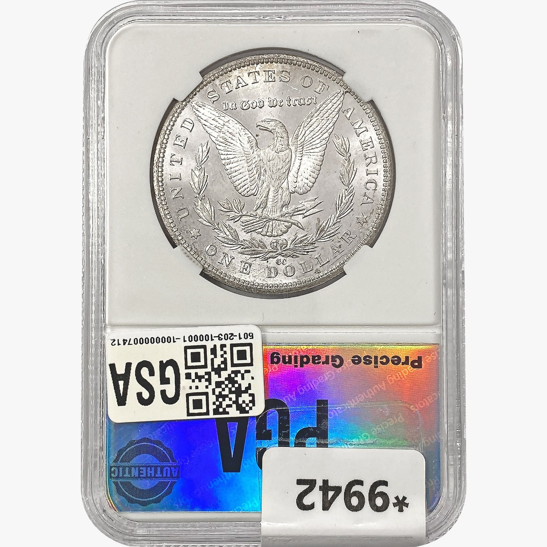 COINS AND CURRENCY LISTED IN GSA’S CATALOG AS GRADED AND ENCAPSULATED BY PCGS, NGC, ANACS, ICG, PCGS CURRENCY, PMG, PCGS BANKNOTE GRADING, CMC OR ANY OTHER THIRD-PARTY GRADING SERVICE ARE LIKEWISE SOLD “AS-IS” EXCEPT AS EXPRESSLY SET FORTH HEREIN. ALL THIRD-PARTY GRADING SERVICE GUARANTEES, INCLUDING AUTHENTICITY, ARE THE SOLE RESPONSIBILITY OF THE THIRD-PARTY GRADING SERVICE AND NOT WARRANTIES OR GUARANTEES OF GSA. BIDDERS SHOULD CONTACT THESE THIRD-PARTY GRADING SERVICES DIRECTLY WITH RESPECT TO ANY CLAIMS OR QUESTIONS THEY MAY HAVE CONCERNING THEIR GUARANTEES AND WARRANTIES. BIDDERS ACKNOWLEDGE AND AGREE THAT AUCTIONEER IS NOT BOUND BY OR LIABLE FOR ANY OPINION OR CERTIFICATION BY ANY THIRD-PARTY GRADING SERVICE. REMOVAL OF A PRODUCT FROM ITS PROTECTIVE CASING OR HOLDER OR ALTERATION OF ANY COIN HOLDER WAIVES ALL RIGHTS CONCERNING THE PRODUCT CONTAINED THEREIN.