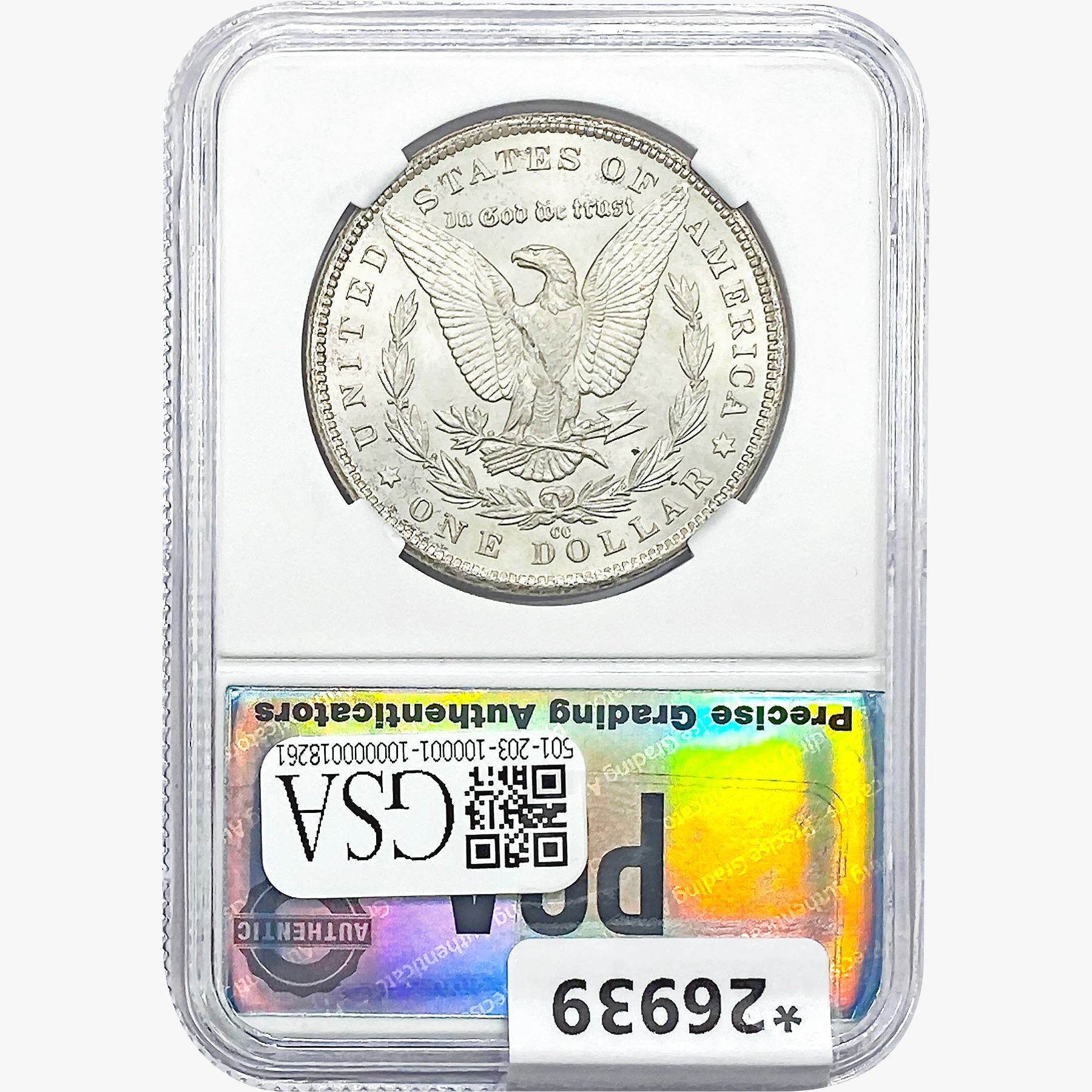 COINS AND CURRENCY LISTED IN GSA’S CATALOG AS GRADED AND ENCAPSULATED BY PCGS, NGC, ANACS, ICG, PCGS CURRENCY, PMG, PCGS BANKNOTE GRADING, CMC OR ANY OTHER THIRD-PARTY GRADING SERVICE ARE LIKEWISE SOLD “AS-IS” EXCEPT AS EXPRESSLY SET FORTH HEREIN. ALL THIRD-PARTY GRADING SERVICE GUARANTEES, INCLUDING AUTHENTICITY, ARE THE SOLE RESPONSIBILITY OF THE THIRD-PARTY GRADING SERVICE AND NOT WARRANTIES OR GUARANTEES OF GSA. BIDDERS SHOULD CONTACT THESE THIRD-PARTY GRADING SERVICES DIRECTLY WITH RESPECT TO ANY CLAIMS OR QUESTIONS THEY MAY HAVE CONCERNING THEIR GUARANTEES AND WARRANTIES. BIDDERS ACKNOWLEDGE AND AGREE THAT AUCTIONEER IS NOT BOUND BY OR LIABLE FOR ANY OPINION OR CERTIFICATION BY ANY THIRD-PARTY GRADING SERVICE. REMOVAL OF A PRODUCT FROM ITS PROTECTIVE CASING OR HOLDER OR ALTERATION OF ANY COIN HOLDER WAIVES ALL RIGHTS CONCERNING THE PRODUCT CONTAINED THEREIN.