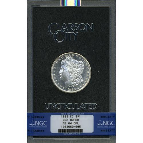 <B>1883-CC<img border='0' src='http://www.heritagecoins.com/images/star.gif' width=10 height=10>$1 MS64 Deep Mirror Prooflike NGC.</B></I> Radiant devices contrast with flashy mirrored fields. The strike is exacting, and the portrait and reverse field are impressively preserved.