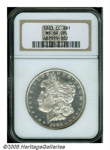 <B>1883-CC<S$1> MS64 Deep Mirror Prooflike NGC.</B></I> The bright surfaces are nearly white, save for a touch of peripheral light color. The design elements are sharply struck throughout, and stand out against the deeply mirrored fields. Minute marks on Liberty's cheek limit the grade.