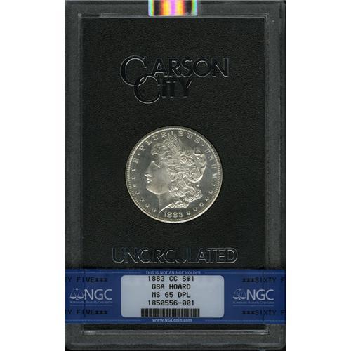 <B>1883-CC<img border='0' src='http://www.heritagecoins.com/images/star.gif' width=10 height=10>$1> MS65 Deep Mirror Prooflike NGC.</B></I> Pleasing cameo frost distinguishes the well struck devices from the reflective fields. A nearly untoned DMPL Gem of this popular CC-mint issue.
