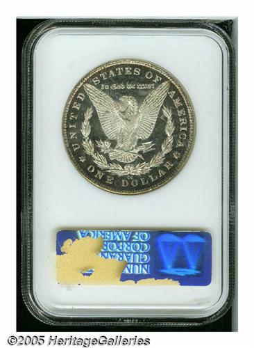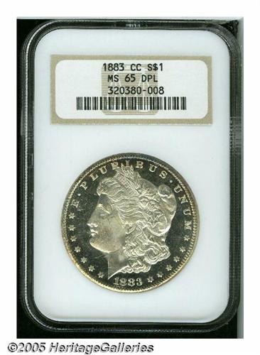 <B>1883-CC<S$1> MS65 Deep Mirror Prooflike NGC.</B></I> Prooflike 1883-CC dollars are relatively plentiful, but they are considerably scarcer in DMPL. This specimen displays deeply mirrored fields that contrast with frosted devices, and traces of reddish-gold patina gravitate to the borders. The design elements are sharply struck, though the hair over Liberty's ear is soft. A few minor luster grazes on Liberty's cheek and in the obverse fields are mentioned for accuracy. What appears to be the remnants of a partial fingerprint is located in the lower reverse near the rim. NGC has seen 54 coins graded higher with the DMPL designation (5/05).