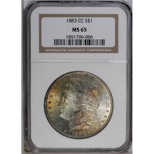 <B>1883-CC<img border='0' src='http://www.heritagecoins.com/images/star.gif' width=10 height=10>$1> MS65 NGC.</B></I> Well struck with pleasing luster. The well-preserved surfaces have colorful toning, with gold, orange, red, and violet patina over both sides.