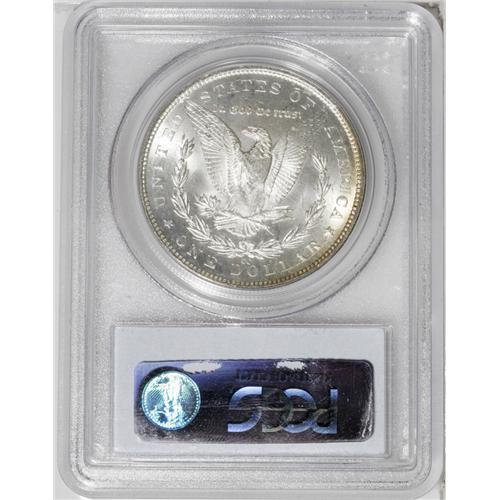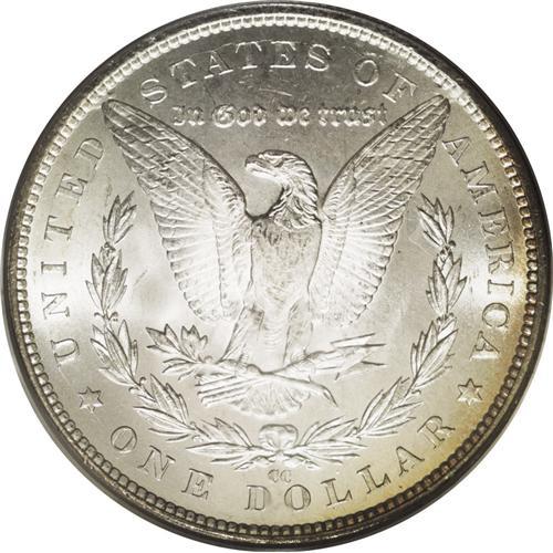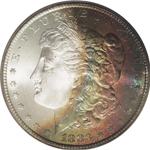 <B>1883-CC<img border='0' src='http://www.heritagecoins.com/images/star.gif' width=10 height=10>$1> MS65 PCGS.</B></I> Half the obverse has crescent toning in violet and goldenrod, while the rest of the obverse and the reverse are frosty and brilliant. A sharply struck example of Carson City silver with plenty of eye appeal.