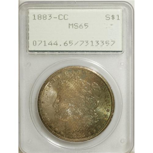 1883-CC S$1 MS65 PCGS. Remarkable canvas bag toning co