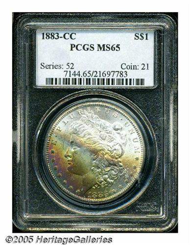 <B>1883-CC<S$1> MS65 PCGS.</B></I> The lower half of the obverse has iridescent rainbow toning, with the balance fully brilliant and frosty. The reverse has bright and frosty silver luster. Sharply struck and attractive.
