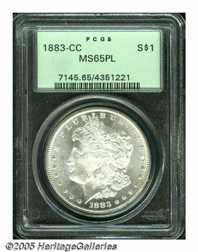 <B>1883-CC<S$1> MS65 Prooflike PCGS.</B></I> Brilliant and well struck with pleasing contrast between the fields and devices, on both sides. A few small marks are noted, on the cheek and in the left obverse field, along with several more on the reverse, but the piece seems reasonably abraded, for a Gem, and the fields are definitely Prooflike.