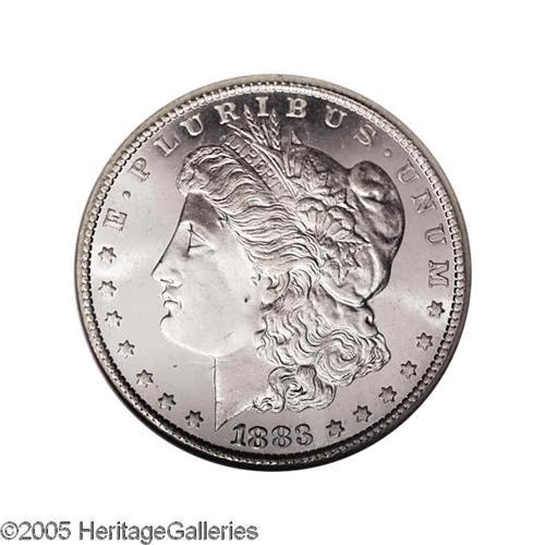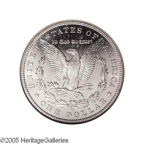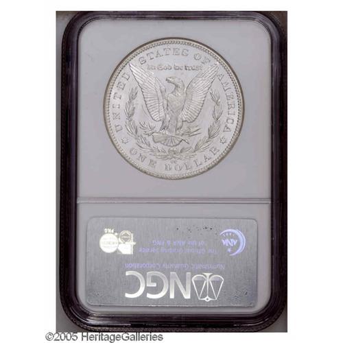 <B>1883-CC<S$1> MS66 Deep Mirror Prooflike NGC.</B></I> A stunning black and white Gem with dynamic reflectivity in the fields and sharply detailed, richly frosted devices. There are a couple of small scrapes and contact marks on each side of the piece, but these seem relatively unimportant in the face of such splendid white-on-black contrast and glittering, deeply prooflike surfaces overall. Census: 32 in 66 Deep Mirror Prooflike, 3 finer (11/05).